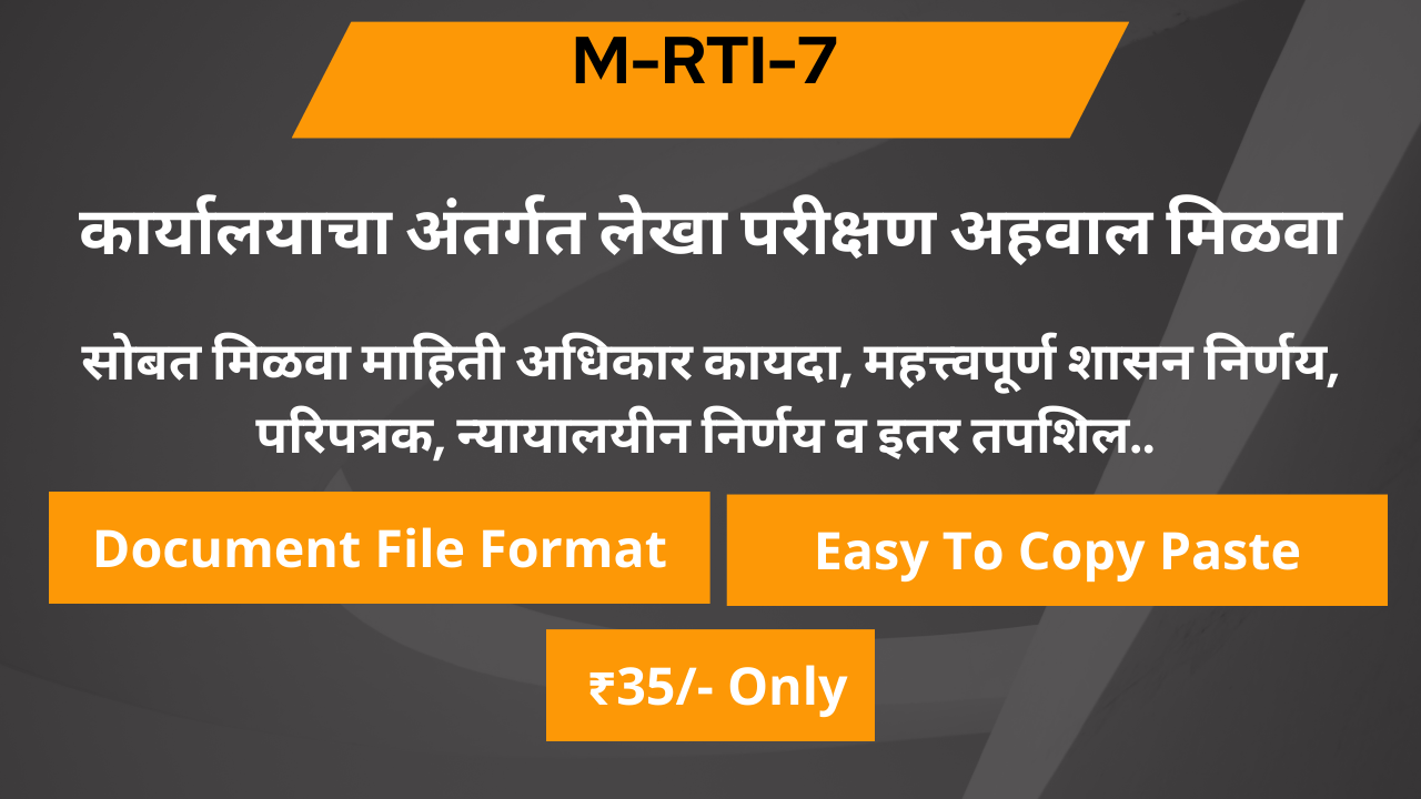 कार्यालयाचा अंतर्गत लेखा परीक्षण अहवाल मिळवा.शक्यतो प्रत्येक सार्वजनिक प्राधिकरण यांचे लेखा परिक्षण होते. त्यामध्ये सर्व आर्थिक व महत्त्वपुर्ण बाबींचा समावेश असतो. अर्ज ईमेल द्वारा मिळवा..