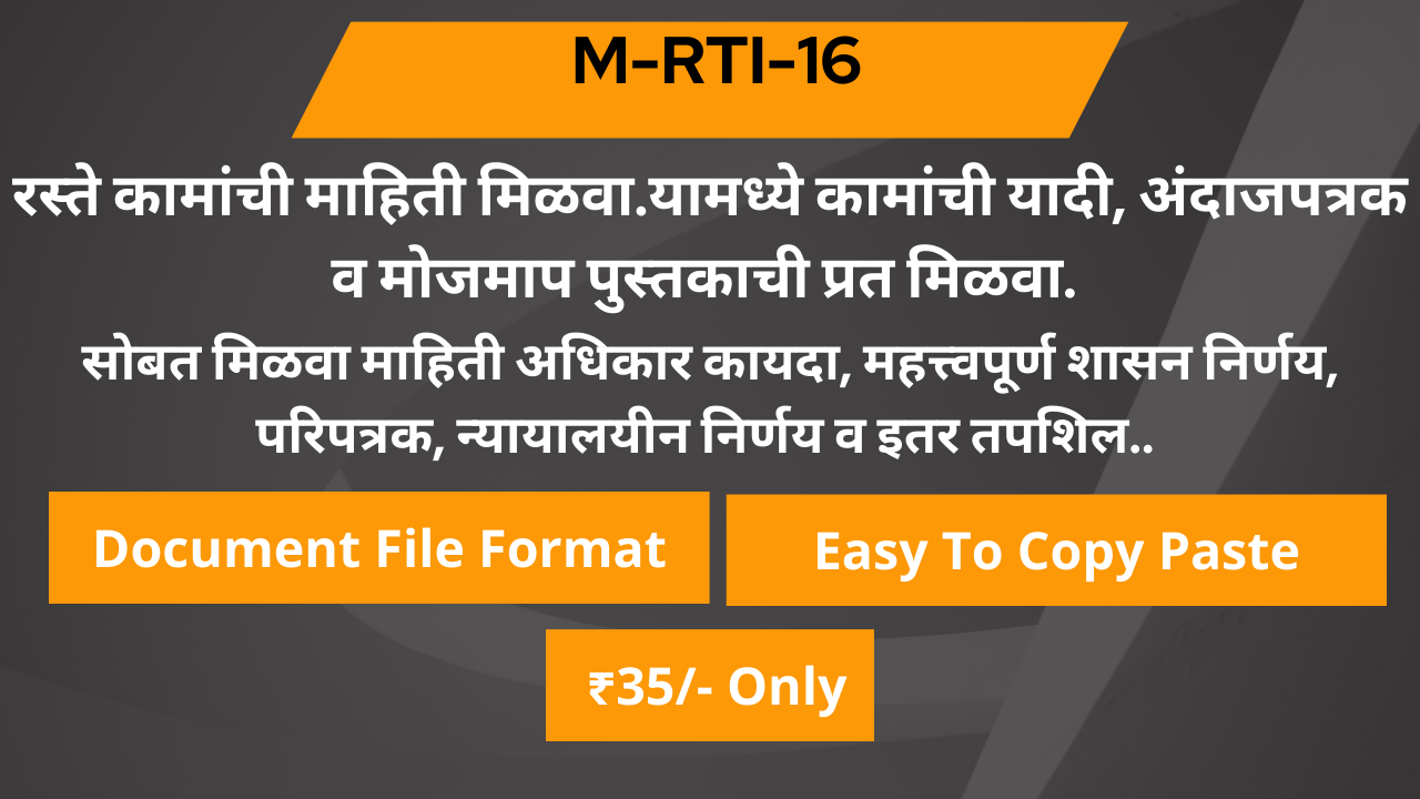 रस्ते कामांची माहिती मिळवा.यामध्ये कामांची यादी, अंदाजपत्रक व मोजमाप पुस्तकाची प्रत मिळवा. अर्ज ईमेल द्वारा मिळवा..